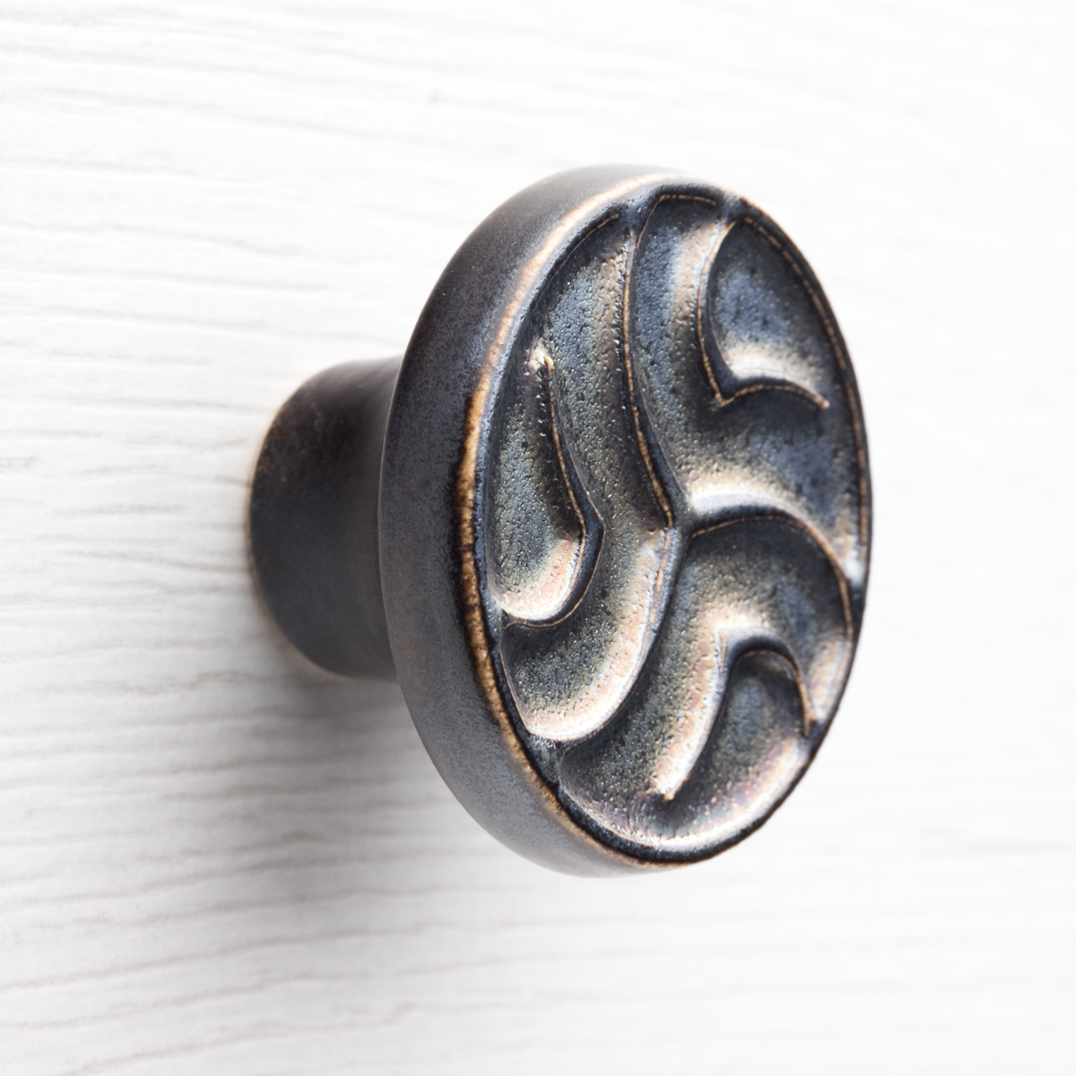 Ceramiczna gałka do mebli z lekko wypukłym ornamentem. Ręcznie wykonana z jasnej gliny, pokryta matowym szkliwem.