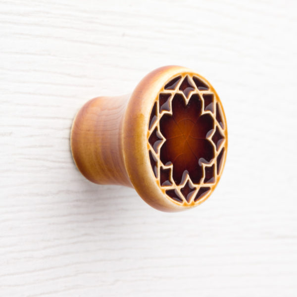 Ceramiczna gałka do mebli z lekko wypukłym ornamentem. Ręcznie wykonana z jasnej gliny, pokryta szkliwem o satynowym połysku.